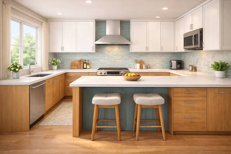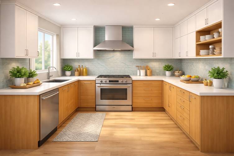 The L-shaped kitchen uses two adjacent walls to form an “L” configuration. It is one of the most versatile and commonly used kitchen layouts in modern homes.