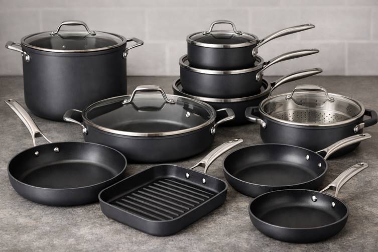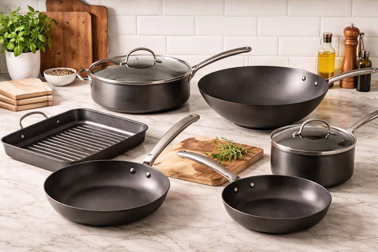 Hard-anodized cookware is aluminum that has undergone a special electrochemical process, making the surface harder, denser, and far more durable than regular aluminum. This treatment transforms aluminum into one of the most reliable types of cookware materials, offering improved strength, corrosion resistance, and a longer lifespan. Home cooks often choose it for its performance without requiring high maintenance.